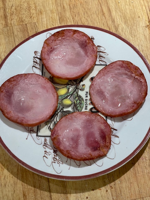 Here is the whole Eggs Benedict routine with Canadian bacon and Hollandaise sauce. I warm up the bacon for 2 minutes on high in the microwave. This has it adopt a shallow cupped shape which neatly holds the poached egg atop the English muffin: