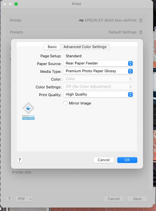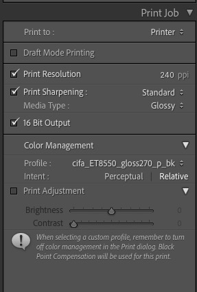 First, Adobe managed to lose all my preferred printer settings on the upgrade to the latest version of Lightroom. In the print module LR switched to Print Job->Color Management->Managed by Printer. This is exactly wrong. What you want is for Lightroom to manage color, not the Epson printer. This permits use of the right paper profile for the printing paper used. It means you control – through Lightroom – color matching rather than having some unknown profile used by the Epson printer. Here’s what you want to see: