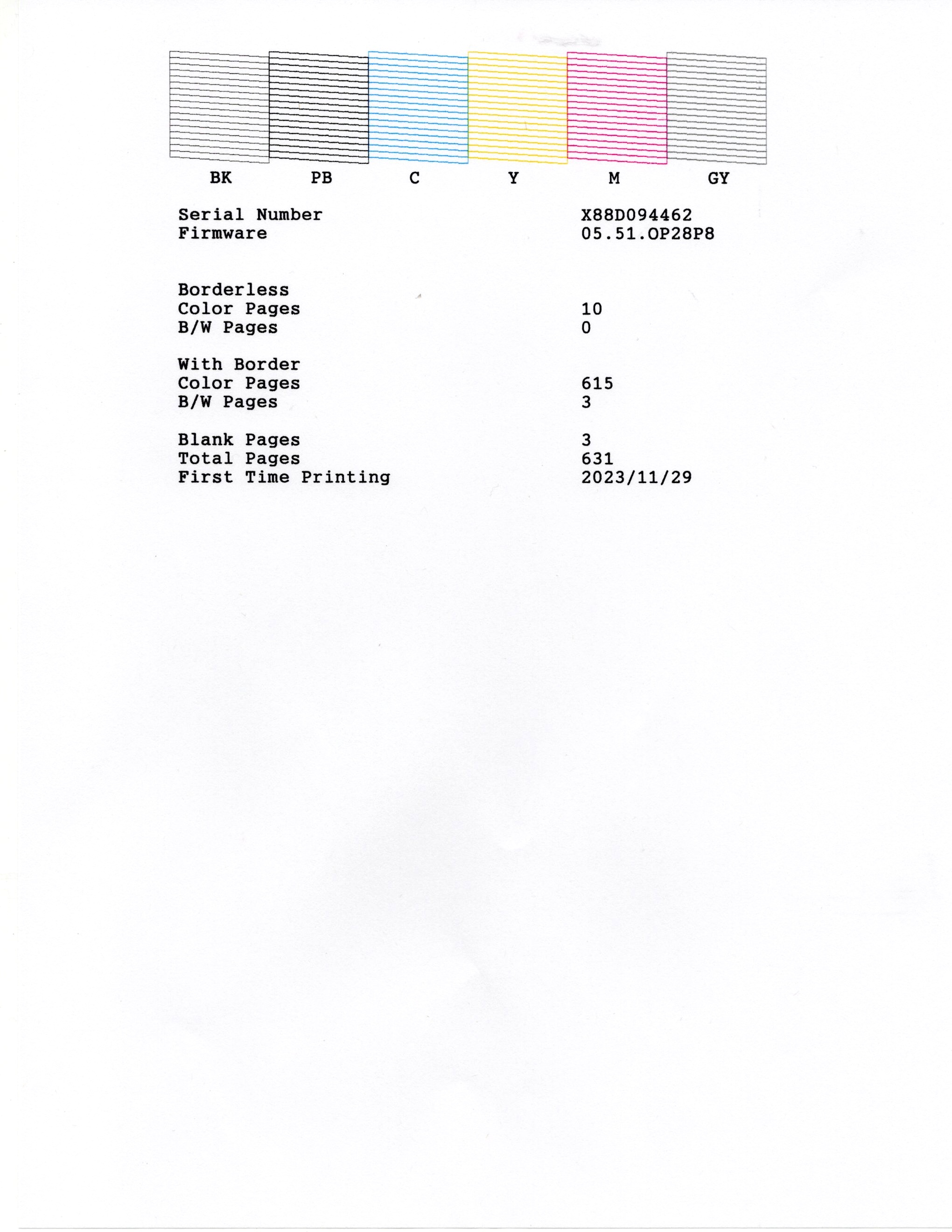 Going to the touch control panel of the Epson ET-8550 go to Maintenance->Print Head Nozzle check, load some 8.5″ x 11″ plain paper in the second tray, and run the check. Mine came out showing bad clogging of both the Magenta and Grey print heads, disclosed by jagged lines in the print out. After running the Maintenance->Print Head Cleaning process twice, again using the touch screen on the printer, I finally got continuous lines for all six heads, thus:
