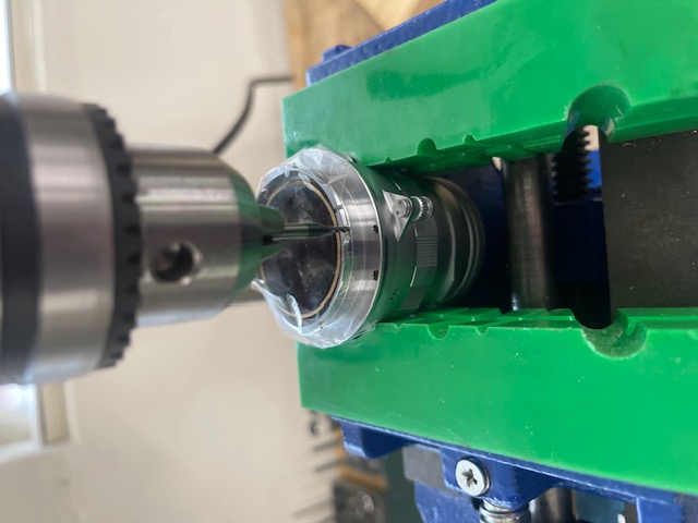 I got a quote of $350 from a respected Leica technician to engrave the code pits on the LLL lens (which he said he would have to dismantle before milling the coding pits), so I decided to do it myself, no dismantling involved. I procured a 1/16″ (0.0625″) diameter flat bottom mill bit – this is the correct size – and set about cutting the requisite code pits myself. The correct pit depth is a scant 0.01″, just enough to avoid abrasion of the ink fill. It’s not critical – you want it deep enough to hold coding ink below the plane surface of the rear flange.