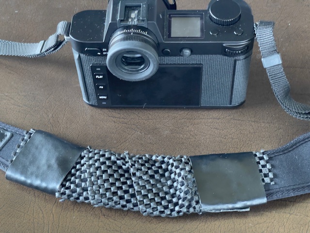The stock strap for the Leica fails in three respects. It has only one rubberized side and they spared the rubber. The other side is as slick as it gets. Duh! And there’s objectionable and loud “LEICA” stitching which helps your neighborhood thief make a beeline for you.